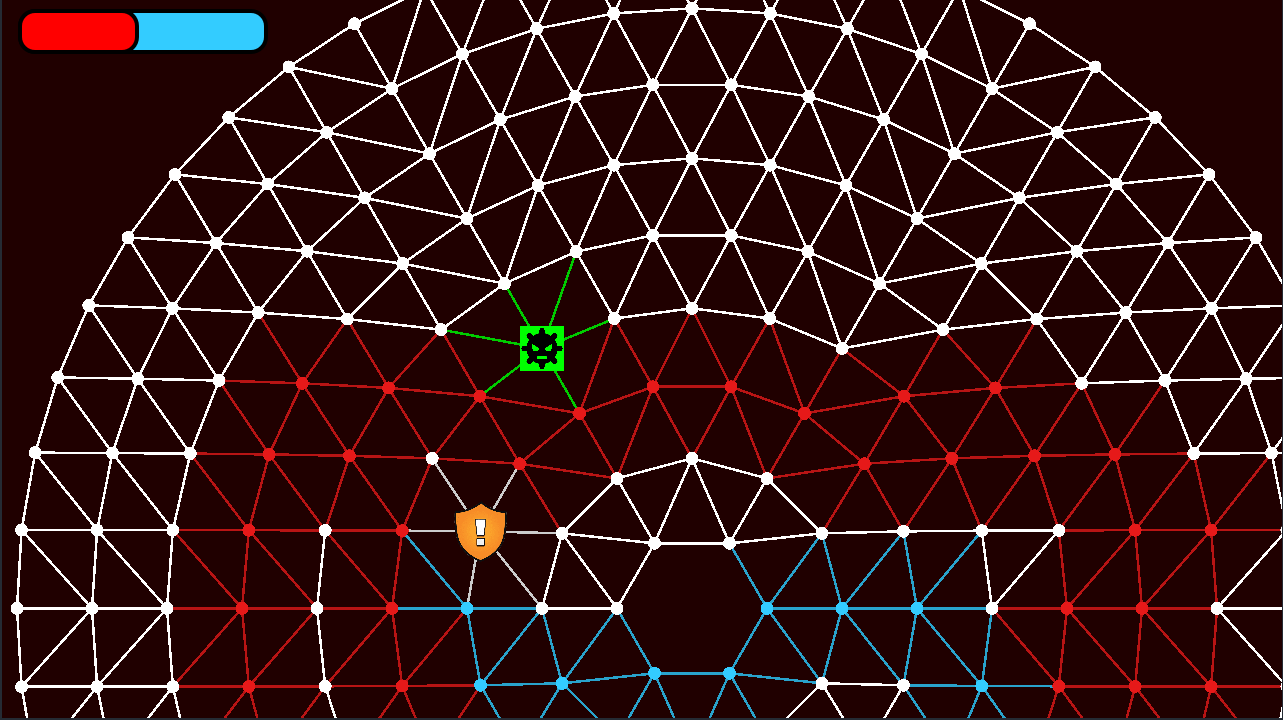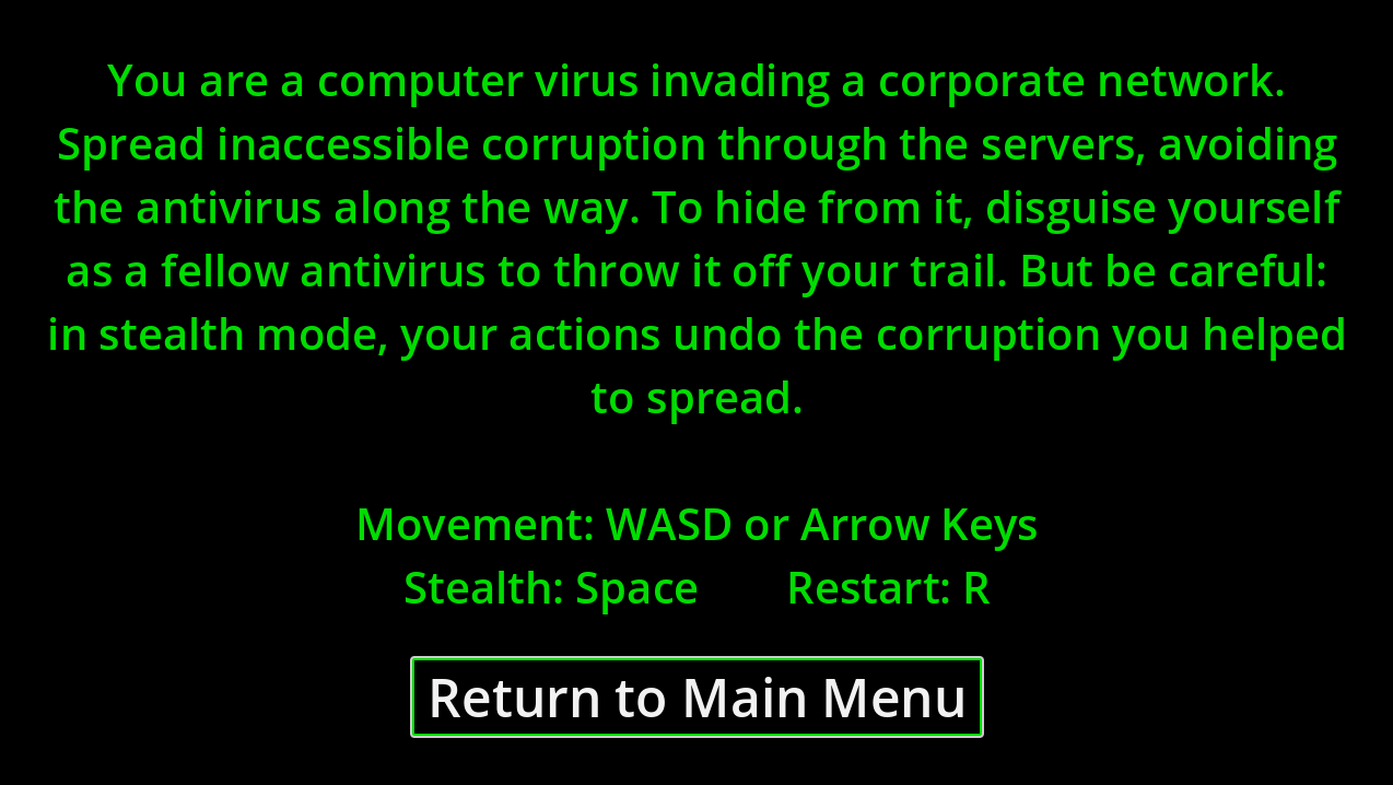 A fast paced strategic game where you play as a piece of malicious code navigating a corporate network, represented as a maze of nodes. As you traverse the network, you corrupt files and the links between them, spreading instability and potentially destroying your own way forward. Meanwhile, there's a corporate anti-virus on your tail that undoes your damage and will delete you if it catches you. To avoid detection, you can disguise yourself as a fellow anti-virus, helping to repair nodes. Through stealth, speed, and skill, your goal is to corrupt the system and cause it to crash.